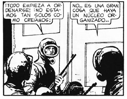 De pronto, con sus cómodos y prácticos uniformes militares, hechos en un par de días para esa lucha, empuñando sus armas y en desigual formación, han recuperado el sentido de pertenencia social y, lo más importante: la dignidad, y hasta el sentido final de sus vidas y de sus muertes (impacta la comparación de las mismas circunstancias con la versión ideologizada que publicara “Gente”, como se aprecia en esta siniestra viñeta; la prepotencia del oficial: ¡o salen, o disparamos! Se trata de OTRO Ejército, otro país, otro “Eternauta… otro Oesterheld).